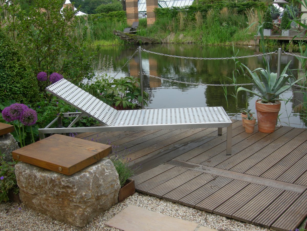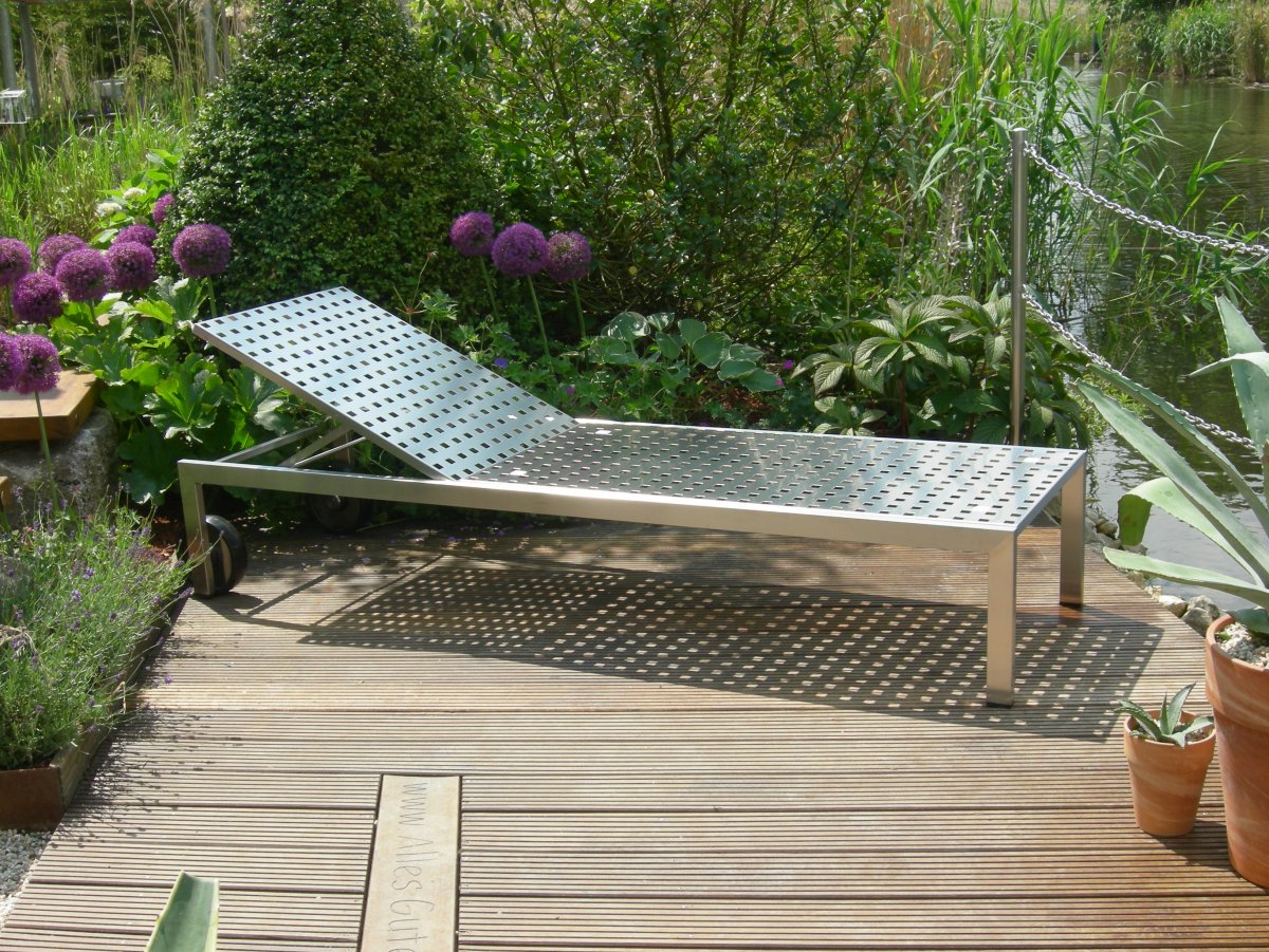 Auf Ihrer Liege von 2,20 m können Sie es sich so richtig bequem machen. Ausgestattet mit wasserfesten Rollen kann die Liege auch ruhig auf feuchtem Rasen stehen bleiben. Das Rückenteil ist 8-fach verstellbar. Für den Gartenbereich verwenden wir Edelstahl mit der Bezeichnung 1.4301. Je nach Einsatzort z.B. Schwimmbad, empfehlen wir salz- und chlorwasserbeständige Qualitäten. Lassen Sie sich von uns beraten.