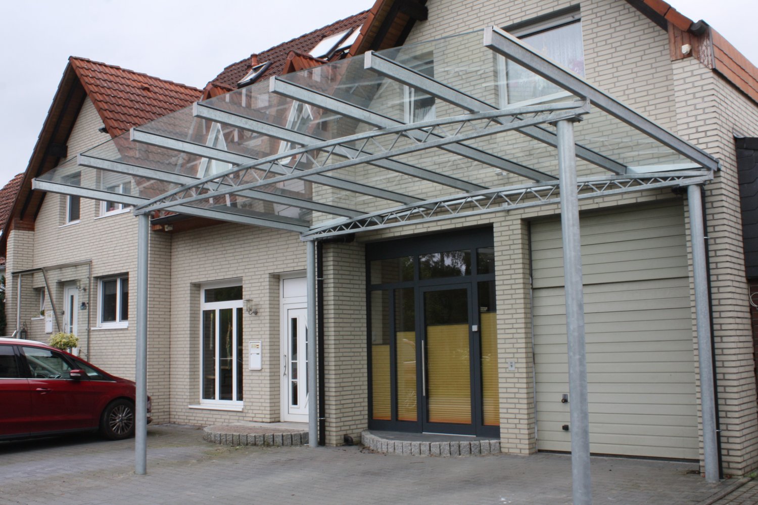 Faszination Edelstahl/Stahl. Ein hochfester Werkstoff, ideal für filigrane Tragwerke. Wir konstruieren und dimensionieren nach individuellen Vorgaben. Ihr Vorhaben ist unsere Herausforderung. Wir übernehmen Bauantrag und Berechnung der Statik. Individuelle Carports - aus Edelstahl oder feuerverzinkt und je nach Wunsch hochfest farbbeschichtet. Integriert dazu ein Gerätehaus, Rankhilfe oder gleichzeitiger Haustür Eingangsüberdachung. Die Eindeckung erfolgt auf Wunsch mit Glas zum Beispiel Klarglas, getöntes Glas, Milchglas. Ein Holzdachstuhl mit einer Unterkonstruktion aus Stahl hat den Vorteil keiner weiteren Stützen im Einfahrtsbereich.