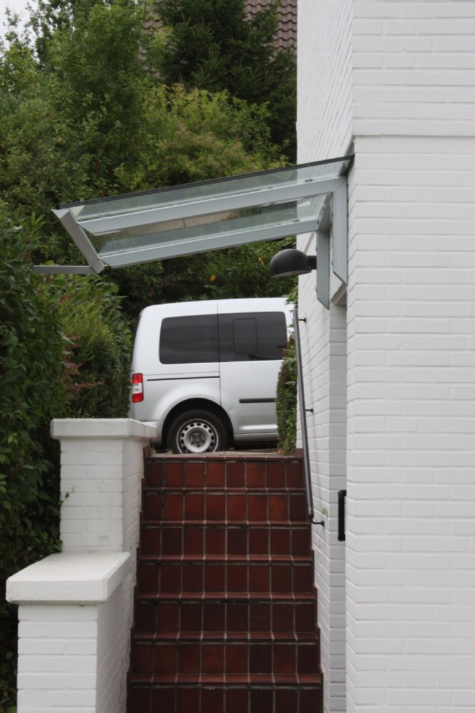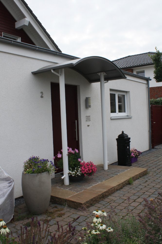 Haustürvordächer – Geschützt im Trockenen. Wäre es nicht schön, wenn Sie ganz in Ruhe noch Ihren Schlüssel aus der Tasche holen könnten um aufzuschließen. Unter unseren Vordächern finden Sie und Ihre Gäste Schutz vor Regen, Wind, Laub und Schnee. Aus unterschiedlichsten Materialien - individuell gestaltet – lassen Sie sich einen Vorschlag erstellen. Wahlweise mit Füllungen aus Klarglas oder getöntem Glas als Verbundsicherheitsglas. Sattel-, Pult- oder Rundbogenvordach, freitragend, mit einem oder zwei Seitenteilen. Kompetente Beratung, Ausführung und Montage gewährleisten neben perfektem Schutz, sicherer Entwässerung und einladender Optik der Vordächer nachhaltige Funktionalität und Wertbeständigkeit über Jahre.
